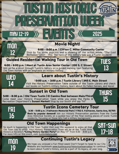 We’ve attached the full event flyer so you can mark your calendars. Plus, be sure to check out our Historic Preservation Week website, going live on May 12, where you’ll find fun facts, resources, and more ways to celebrate: www.tustinca.org/ HistoricPreservationWeek