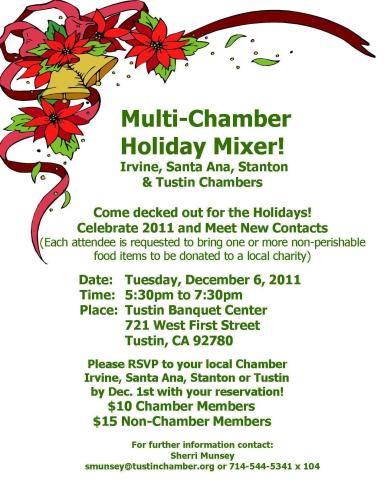Multi-Chamber Holiday Mixer with Irvine, Santa Ana, Stanton and Tustin Chambers. Come decked out for the Holidays! Celebrate 2011 and meet new contacts. Each attendee is requested to bring one or more non-perishable food item to be donated to a local charity.