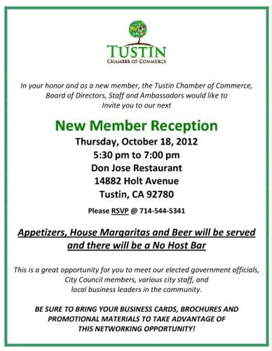 This reception is in honor of the New Members who have joined the Tustin Chamber of Commerce. Appetizers, House Margaritas and Beer will be served and there will be a No Host Bar.
