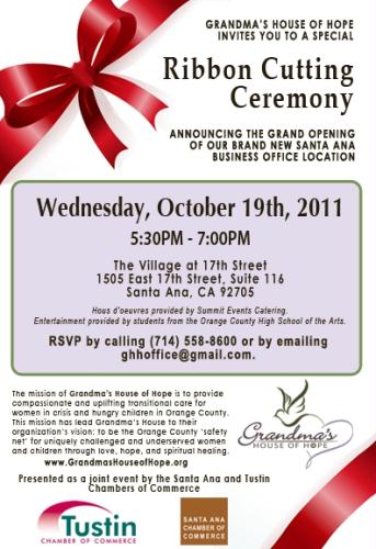 Join the Tustin Chamber for a Ribbon Cutting for Grandma's House of Hope. They are a non-profit organization Santa Ana. A little bit of info from their company, From 2004-2010, GHH evolved from an emergency shelter with 10 beds specializing in recovery and addiction, to a 24-month transitional housing program, providing supportive services with a goal of self-sufficiency and permanent housing. The program now offers case management, group and individual counseling, meals, and workforce development. In addition, they are provided with medical referrals, basic job search and training assistance, wardrobe assistance, daily meals, and a place to live that is safe and stable. GHH welcomes hard-to-place cases, lifting the emphasis of the issue and focusing on the individuals specific needs, such as serious illness or treatments, that may make it difficult for them to qualify for other programs. For example, this includes women fighting breast cancer, victims of human trafficking, and women struggling with mental illness such as dual-diagnosis. The women in the program are taught that acceptance, support, and respect are the building blocks of successful relationships. GHH also offers the Nana’s Kidz program, which serves over 300,000 meals annually to 345 kids in Orange County that are currently living in motels. GHH has recently added Hope Works!, which offers workforce development services for participants in our Transitional Housing program, as well as clients of the Nana’s Kidz program. Through services to each other and their community, women become empowered and achieve independence, accountability, and spiritual growth.