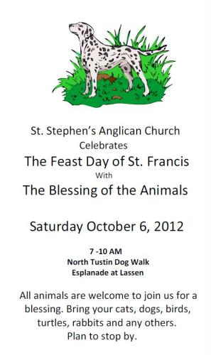 Come and join St. Stephen's Anglican Church and celebrate The Feast Day of St. Francis with The Blessing of the Animals. All animals are welcome to join us for a blessing. Bring your cats, dogs, birds, turtles, rabbits and any others. Plan to stop by.