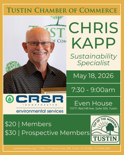 The Tustin Chamber of Commerce invites you to join us for Top of the Morning Tustin, our monthly legislative and community breakfast series. This event is designed to keep members and community leaders informed about key issues, opportunities, and developments that impact Tustin and the surrounding region.